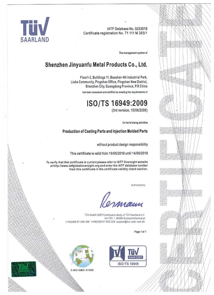 深圳市金源福五金制品有限公司成立于2003年。公司擁有8000多平方米生產(chǎn)廠地、開發(fā)與管理精英人才、技術(shù)專業(yè)、設(shè)備精良、交通便利、服務(wù)周全、具體設(shè)計、開發(fā)、制模、出樣、生產(chǎn)到成品出貨一體化模式生產(chǎn)廠家。已通過ISO9001:2008ISO1440/TS16949:2009國際質(zhì)量體系認證。專業(yè)生產(chǎn)鋅合金壓鑄、鋁合金壓鑄產(chǎn)品、汽車配件、汽車后視鏡支架、車載導(dǎo)航散熱器、LED散熱器、LED燈罩、數(shù)碼電子五金結(jié)構(gòu)件、家具五金裝飾件、標(biāo)牌(LOGO)等五金壓鑄產(chǎn)品。